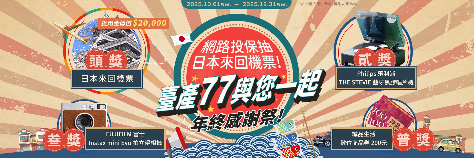 日本來回機票抵用金、Philips 飛利浦THE STEVIE 藍牙黑膠唱片機、、FUJIFILM 富士 Instax mini Evo 拍立得相機、誠品生活數位商品券等多項大獎。