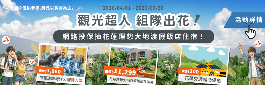 花蓮理想大地渡假飯店住宿、花蓮遠雄海洋公園雙人票、花蓮交通補助優惠…等多項大獎。